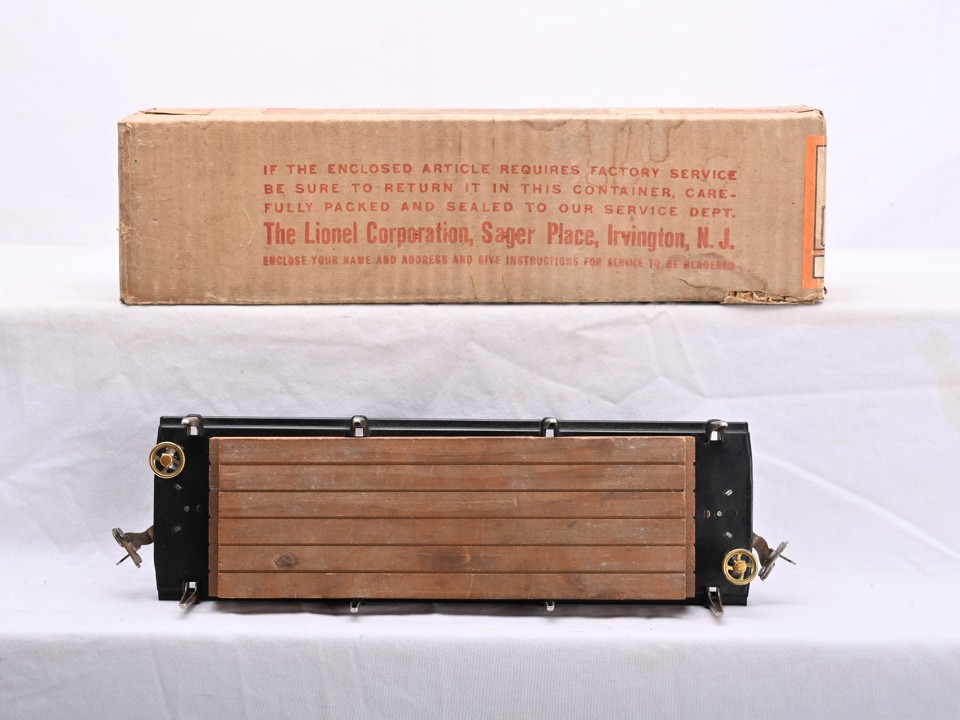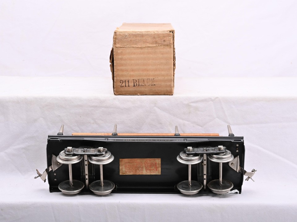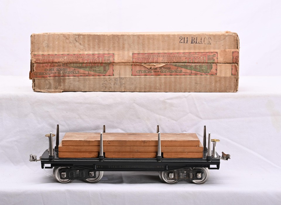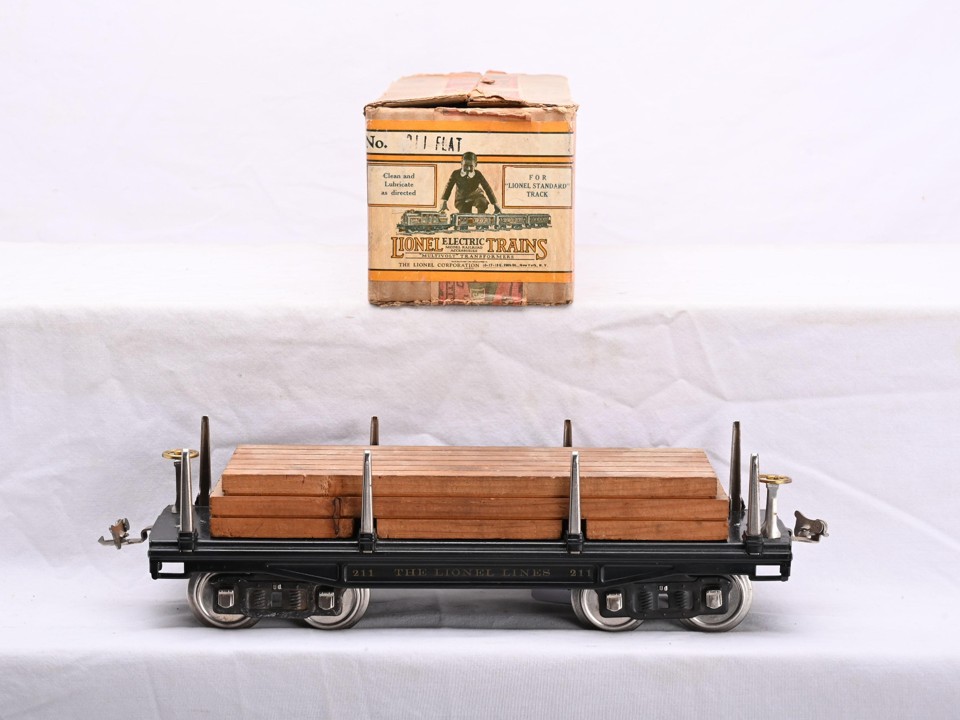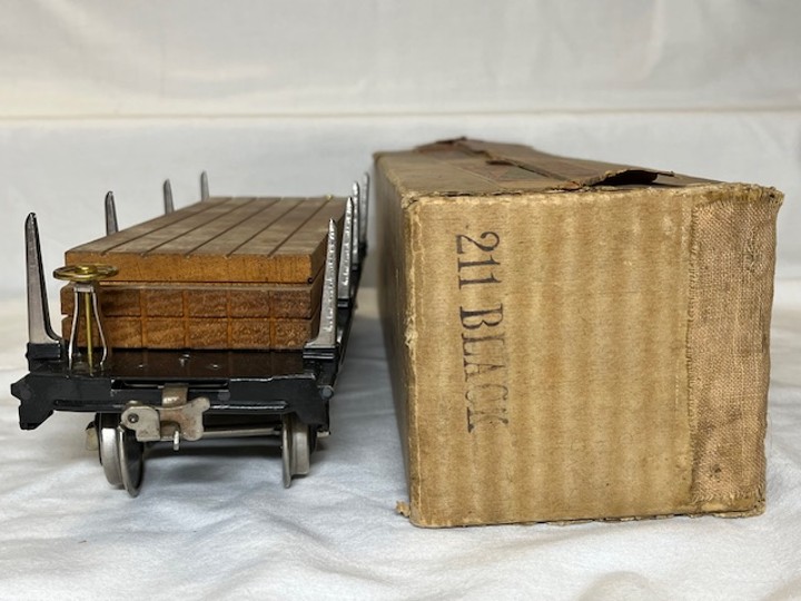 Lionel standard gauge No. 211 flatcar early variation with original load in black paint, nickel journals, mixed trim, and brake wheel on the right side (circa 1926).