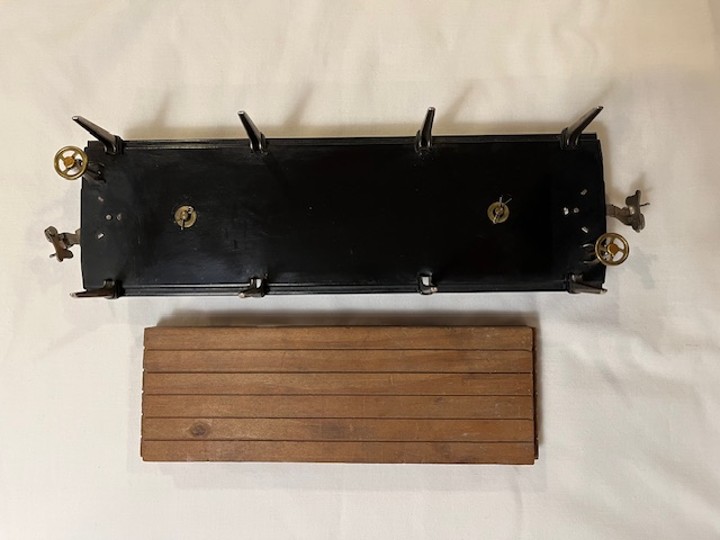 Lionel prewar standard gauge 211 black flatcar with original lumber load, copper journals, mixed trim, brake wheel on the right, and cotter pin fasteners to hold the trucks to the frame. Offered from 1926-1940. This version is circa 1930.