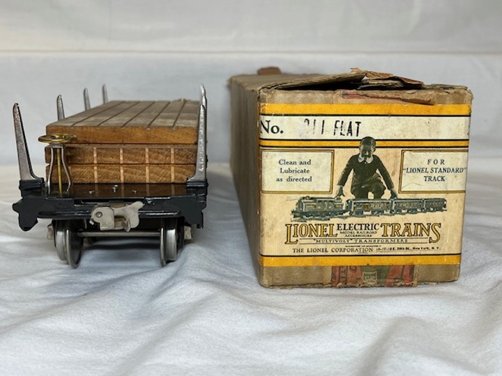 Lionel prewar standard gauge later version all nickel trim 211 flat car with lumber load with original box. Nickel journals and trim with break wheels on the right side, type four break wheel. Circa 1936-1940