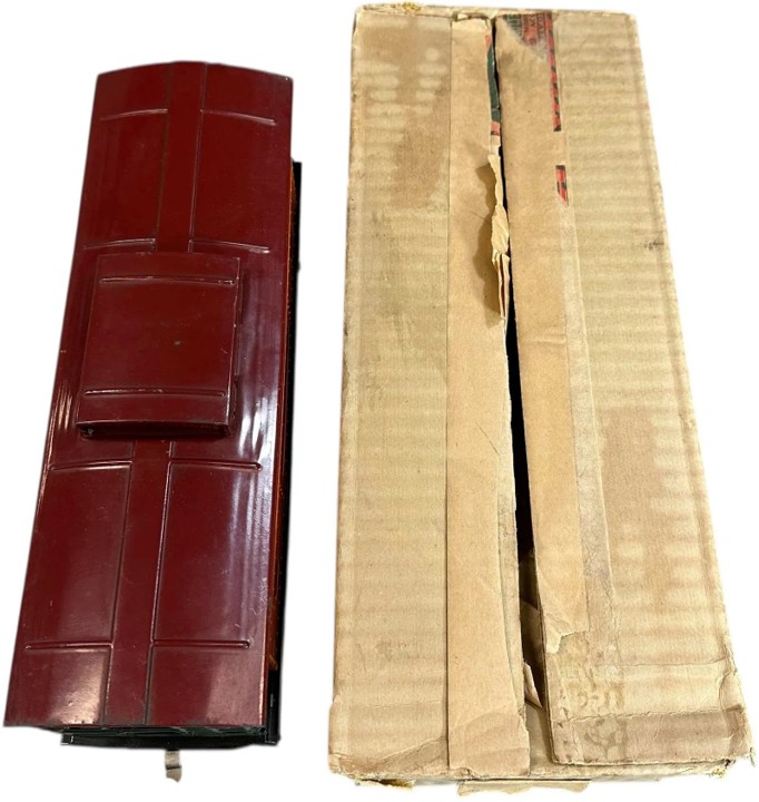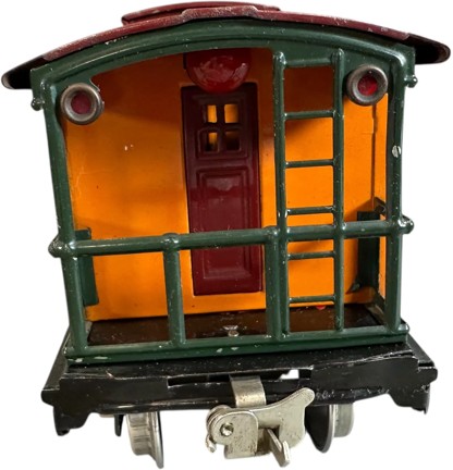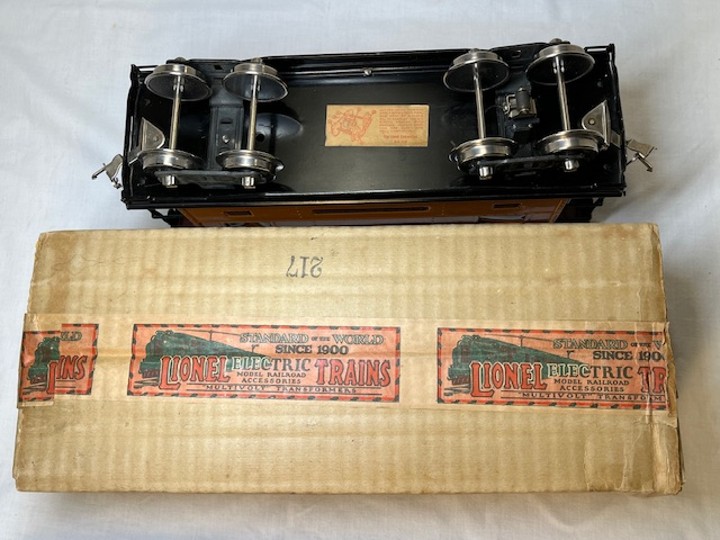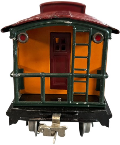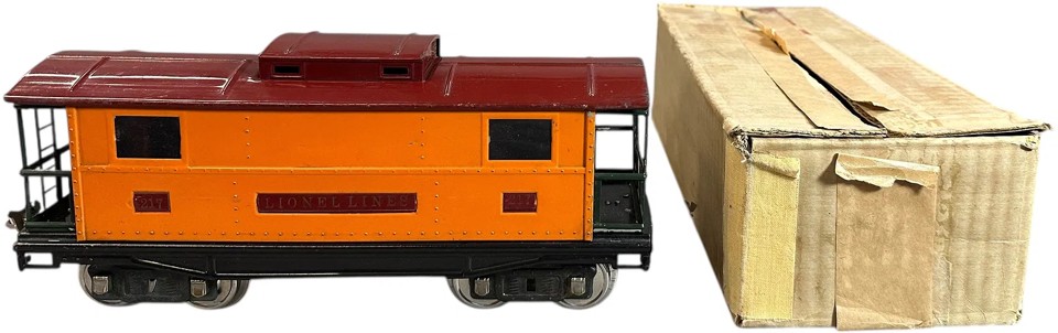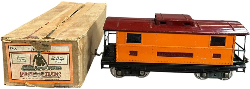 Lionel prewar standard gauge 217 circa 1926. Orange caboose hard to find earliest version with celluloid material in windows, maroon roof and plates, dark green end railings, and nickel journals in OB.