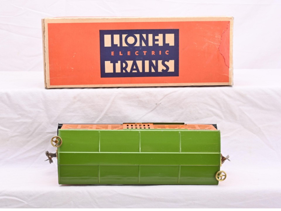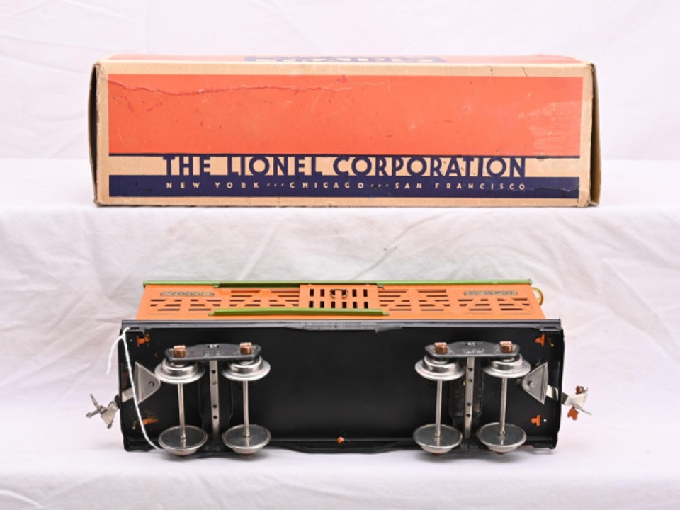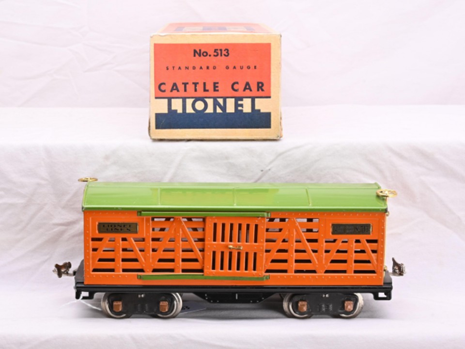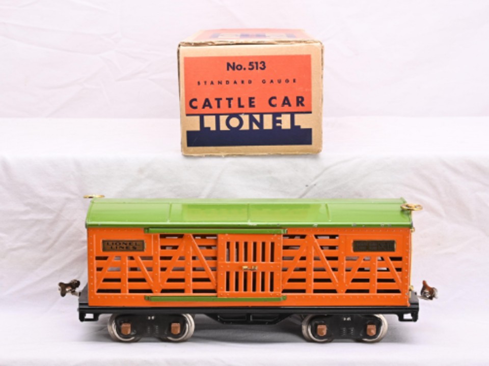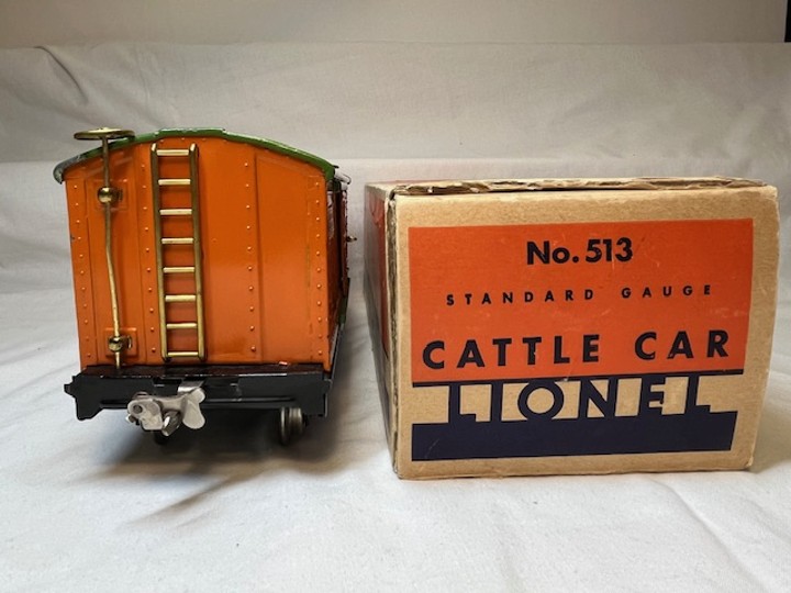 Standard Gauge No. 513 Cattle car circa 1930 – orange body with pea green roof and door guides, brass trim, copper journals, copper pin fasteners, T3 brake wheels