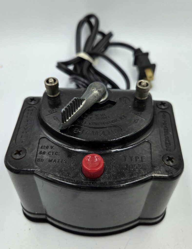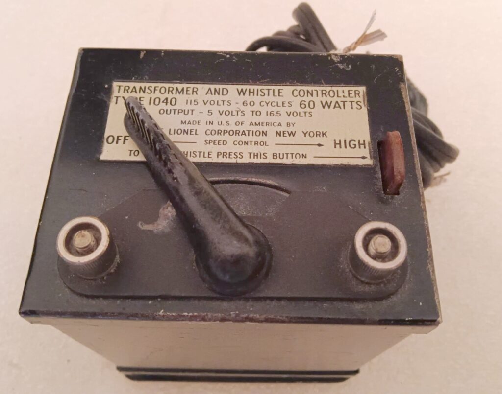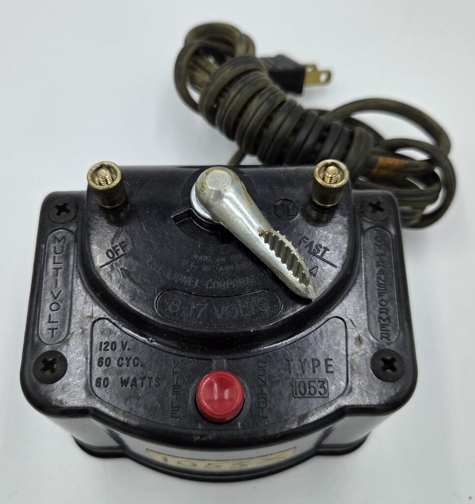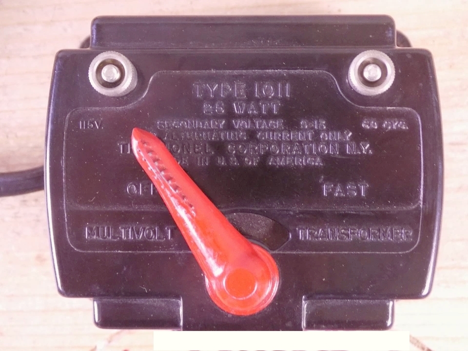 According to John’ Schmid’s Authoritative Guide to Lionel’s Promotional Outfits, “the no. 1063-100 75-Watt Transformer included a green whistle control button to indicate changes made to the whistle control circuitry to prevent the Scout-type locomotives from inadvertently reversing. Its Production Control File states, “Rubber Stamp ‘1063-100’ on Bottom of Base Plate Assembly using White Ink.”